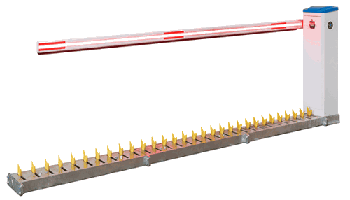 The barrier arm and spikes are driven by two separate motors. The spikes can be recessed or surface mounted and are automatically raised when the barrier arm is lowered, and lowered when the barrier arm is raised, to ensure safe passage of vehicles.