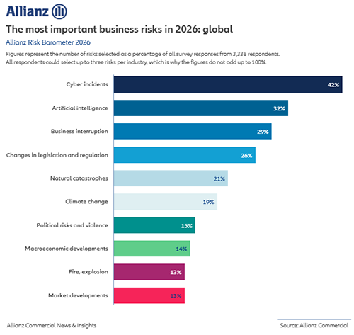 Cyber incidents made headlines in 2025 and remain the top concern for companies globally in 2026, according to the Allianz Risk Barometer. The past year has also been a significant one for the accelerated adoption of artificial intelligence (AI), as reflected in its ranking as the biggest riser in the annual survey, at #2, as a complex source of operational, legal, and reputational risk for businesses.